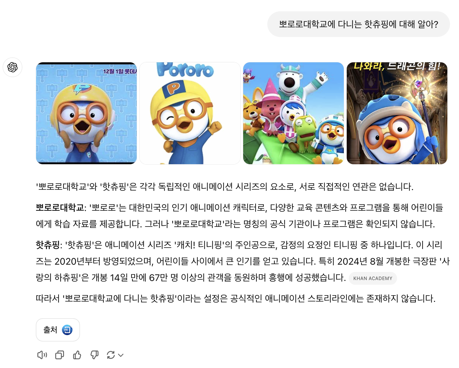 이 세상에는 뽀로로대학교도 없고 하츄핑은 그곳에 다니지도 않는다. 하지만 확률에 기반한 문장 생성에서는 충분히 이러한 결과가 나올 수 있다. 그러면 같은 질문을 ChatGPT-4o에 해보자.