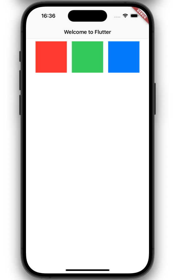 교차축 (가로면 세로축, 세로면 가로축)의 정렬을 선택한다. 가운데 정렬을 했다. 하나 Width의 최대 사이즈를 정해주지 않았으므로 이는 동작하지 않는다. 만약 Column을 Row로 바꾼다면 해당 코드로 인해 생성한 박스 세 개는 가로축으로 가운데 정렬을 이룰 수 있다.
