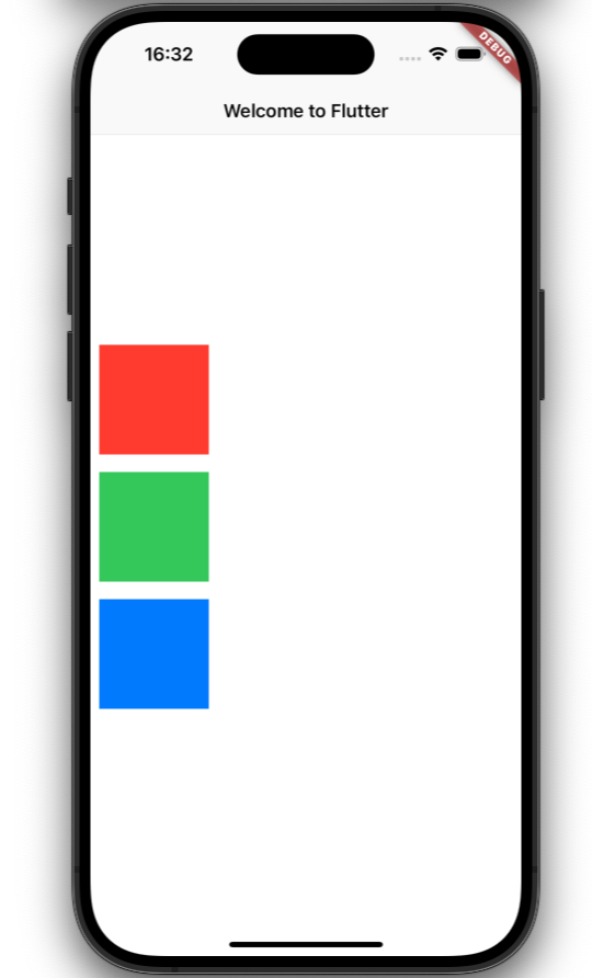 마지막으로 stack 위젯이다. 화면 위로 (z axis) 쌓아 올리는 방식인데, children 요소에서 첫 번째 요소부터 아래에 깔리기 때문에 요소의 순서가 중요하다. 가운데 정렬로 색이 다르게 배치해 보았다.