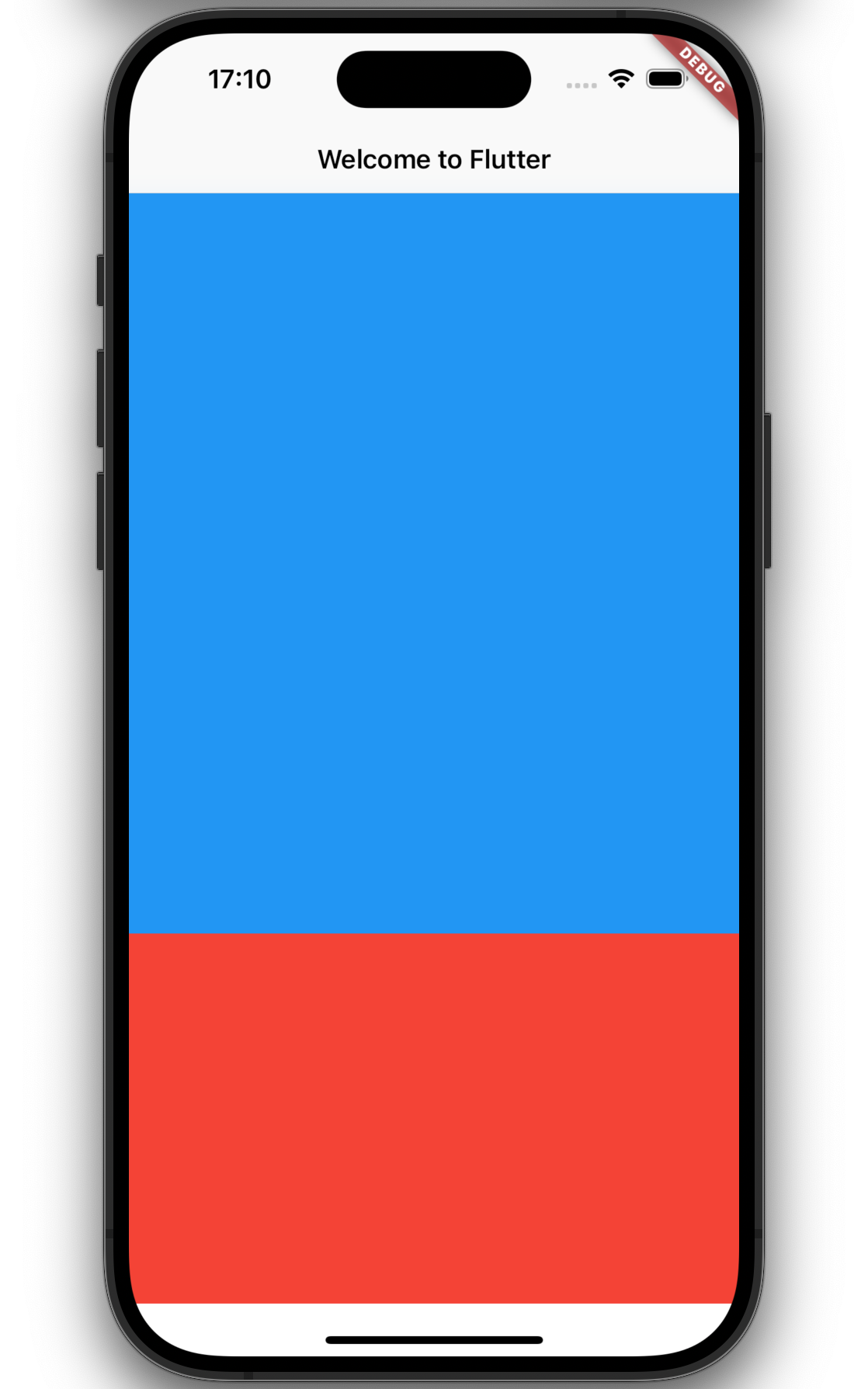 다음으로는 flexible widget이다. flexible 위젯은 남은 공간을 비율별로 차지한다. 이해를 위해 파란 컨테이너와 빨간 컨테이너를 children 위젯으로 감싸서 Column 방향으로 2:1로 배치해 보았다.
