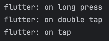 제스처이다. 버튼이 아니라 객체 위에서 여러 제스처를 감지할 수 있다. 예시에서는 빨간 컨테이너에 클릭, 더블 클릭, 꾹 누르기 제스처를 추가하고 해당 제스처에 맞는 로그를 찍는 태스크를 구현해 보았다. 아래와 같이 모든 제스처에 대해 잘 나오는 것을 확인할 수 있다.