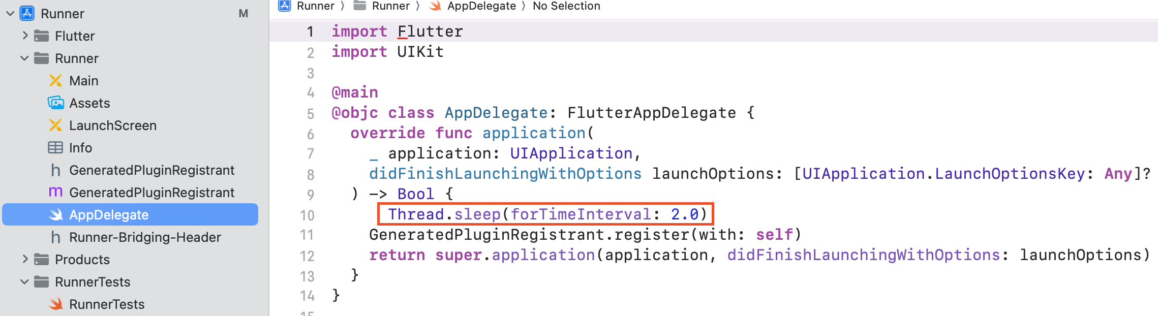 사실 앱 자체가 초반에 이것저것 불러들일 게 많으면 이 런치스크린에서 처리하기 때문에 이 화면을 오래 볼 수 있지만, 이렇게 예제로 만들어 볼 경우에는 너무 확 넘어가서 잘했는지 구별이 안 갈 수도... 그래서 약간의 기믹을 줘 보자! 런치스크린이 등장하고 2초의 딜레이를 주는 코드를 AppDelgegate에 작성해 주면 된다.